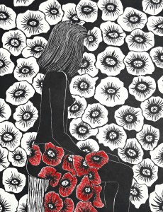 April 2, 2018November 6, 2023 | studiociboulette genevieve guadalupe deep in thoughts woodcut embroidery 35x27in 89x69cm 2017