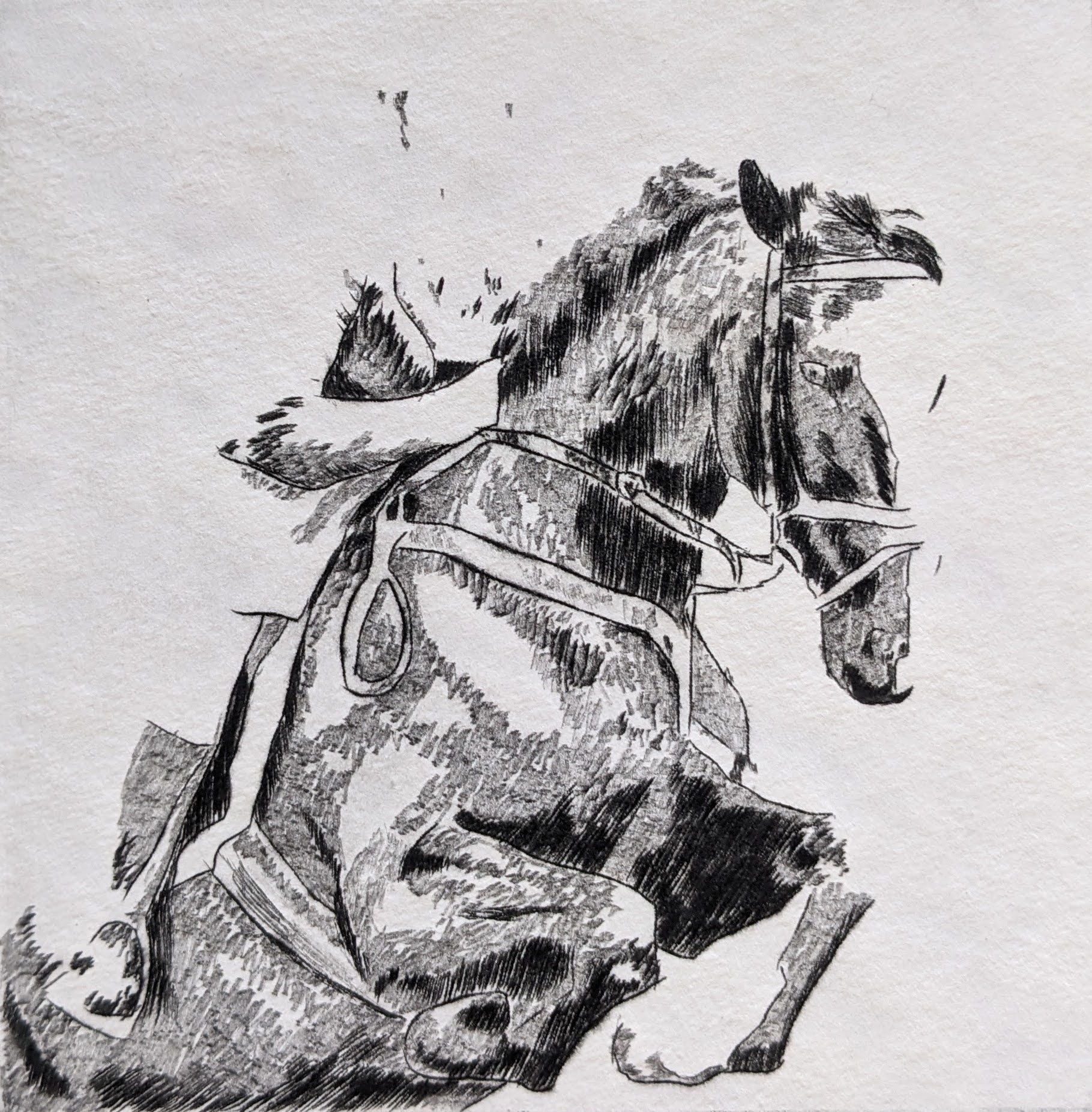 September 28, 2023November 6, 2023 | studiociboulette genevieve guadalupe equestrian drypoint 5.5×5.5in 14x14cm 2012