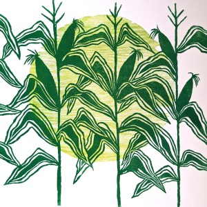 September 28, 2023November 6, 2023 | studiociboulette genevieve guadalupe maize woodcut green 16x16in 41x41cm 2020