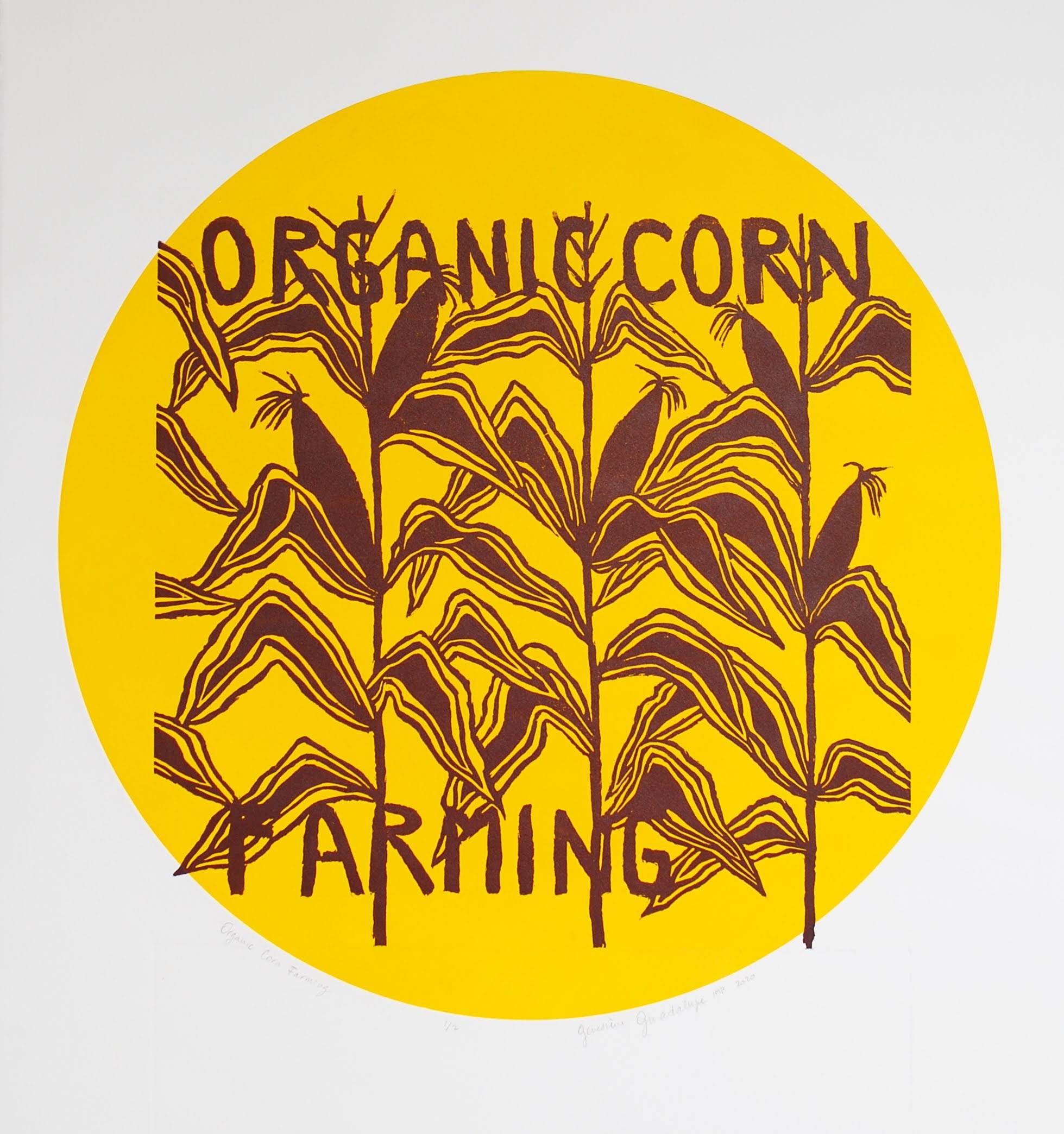 August 1, 2020November 6, 2023 | studiociboulette genevieve guadalupe organic corn farming relief woodcut 15.5×15.5in 40x40cm 2020